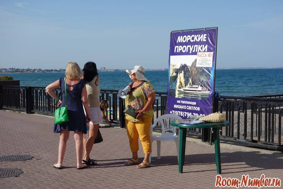 Транспорт. По городу ходят автобусы, но для нашего маршрута они не понадобятся. Стоимость проезда — 17 Р. Еще есть экскурсионные электрокары, они стоят у галереи Айвазовского. За 600 Р с человека они провезут по достопримечательностям города, за 100 Р прокатят по набережной. Чаще всего отдыхающие перемещаются пешком или на такси. Самые популярные — «Пикап-такси» и «Максим»: +7 978 070-77-77. Поездки на такси обходились мне в 150—200 Р.