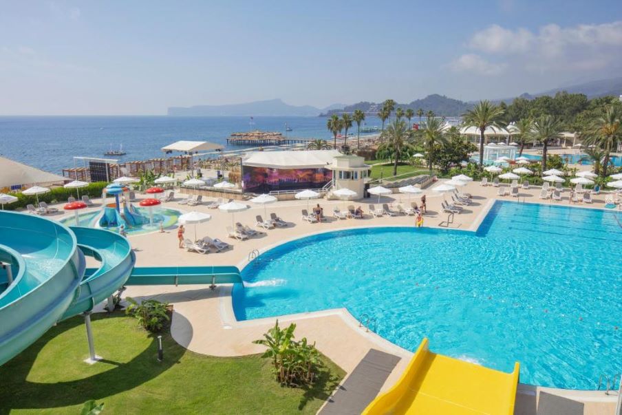 Более современно смотрится отель Club Hotel Belpinar 4*. Он меньше предыдущего, компактен, тоже имеет пляж и четыре бассейна с водными горками.