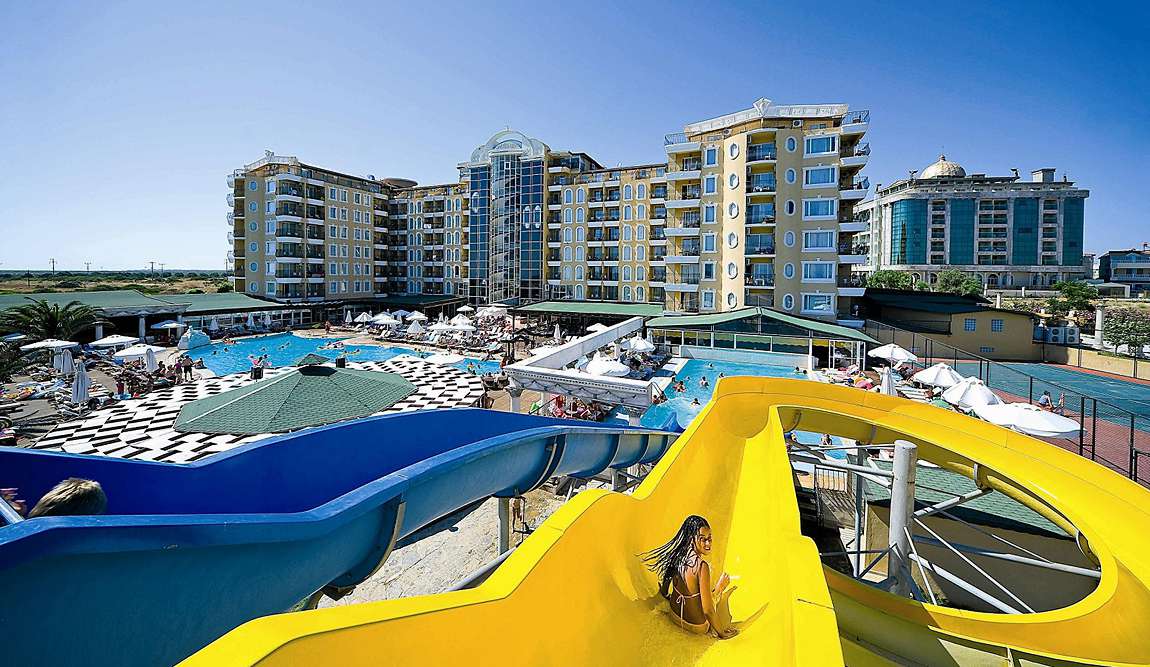 Отличный отель, в котором особое внимание уделено ландшафтному дизайну: тут и зеленый сад, и искусственный водоем с рыбами и лебедями. На территории работает аквапарк с 7 горками, есть масштабная детская площадка с колесом обозрения