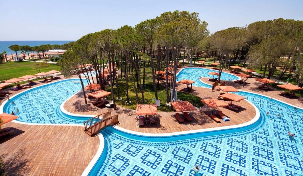 Еще один достойный представитель нашей двадцатки отелей Турции 5 звезд, который подходит, в том числе для отдыха с детьми. Современные номера, большая зеленая территория, оборудованная для комфортного досуга, аквапарк с семью водными горками, питание «все включено премиум класса», для детей – специальное меню.