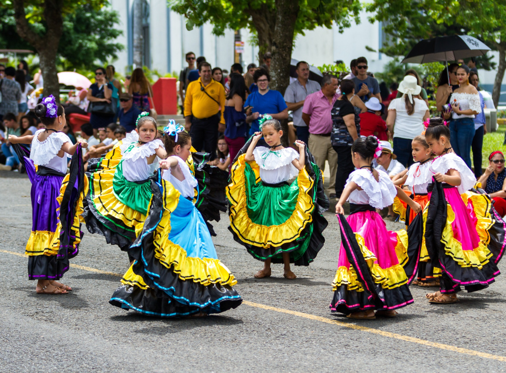 Дети празднуют День независимости в Коста-Рике, танцуя в традиционной одежде