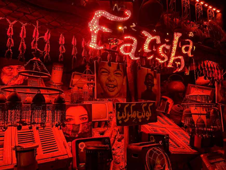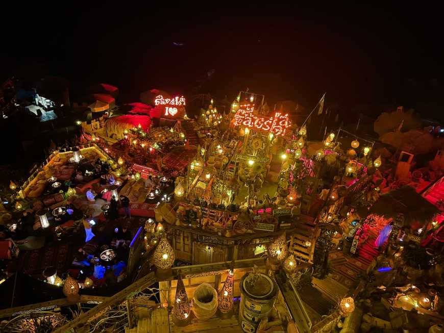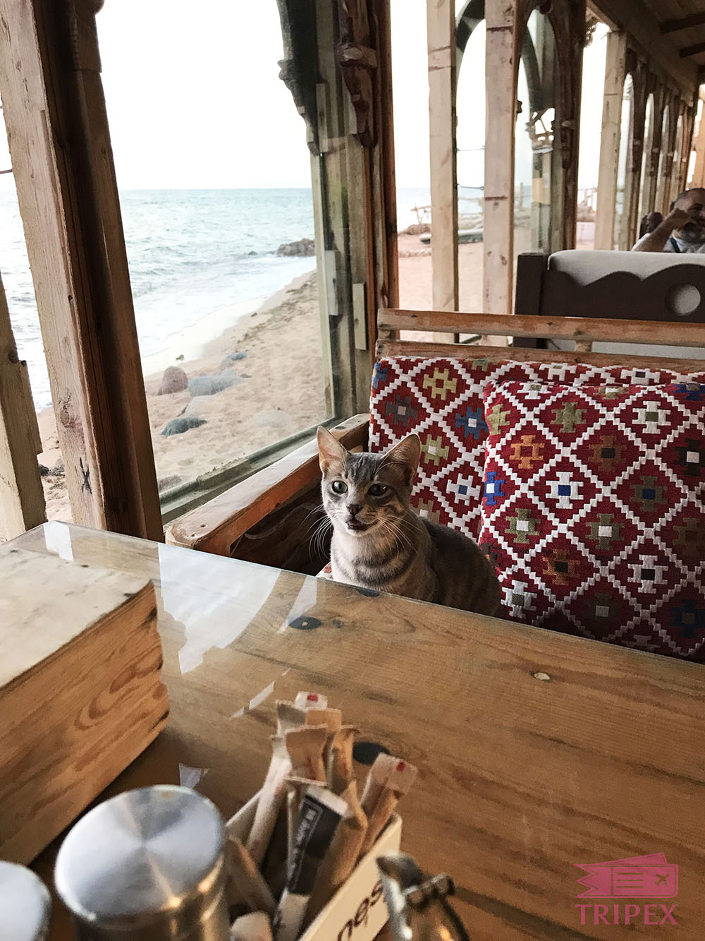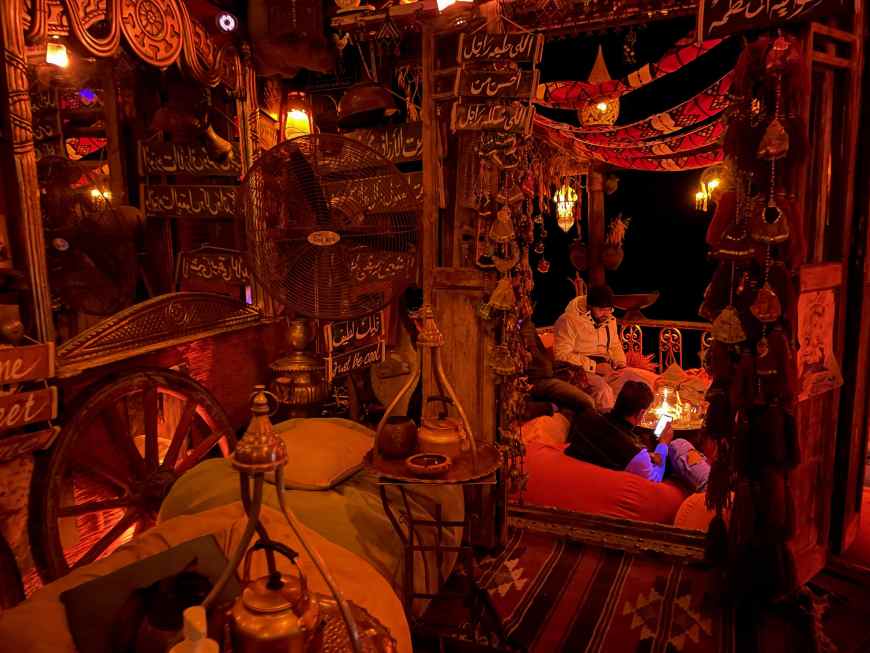 Farsha – супер-пупер модное молодежное место. Здесь огромный выбор напитков, мой любимый — горячий яблочный сок с корицей (фирменный Farsha Drink). Так же при Вас сварят кофе на песке или просто откроют холодное пиво. Фарша обустроена на скале в форме корабля, места находятся на разном уровне. Здесь вечерами по выходным очень тусовочно, зато на закате весьма тихо и романтично. Но самое главное — в Фарше очень много деталей, таких как старые велосипеды, швейные машины, портреты и прочая старинная утварь. Их можно рассматривать часами. А персонал ходит в длинных бедуинских платьях, что дополняет атмосферу.