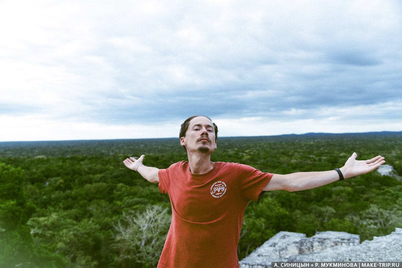 Мы забрались на вершину пирамиды в древнем городе майя Калакмуль с огромной территорией, где почти нет туристов. Ходить и лазать можно везде. Настоящий рай для любителей поиграть в первооткрывателя.