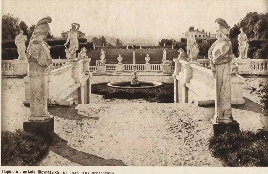 На площадке, позади партера, – цветник с фонтанами и огромная статуя Геркулеса и Флоры. По сторонам – небольшие рощицы из зеленых газонов, обсаженных рядами лип. При Н. Б. Юсупове у стены нижней террасы в вольере гуляли фазаны и павлины, верблюды и ламы, редкие породы кур и индеек, в прудах разводили осетров.