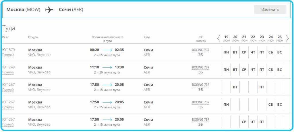Система выдает расписание ЮТэйр, в котором указывается наименование рейса, время вылета, направление, самолет и класс, а также дни отлета.