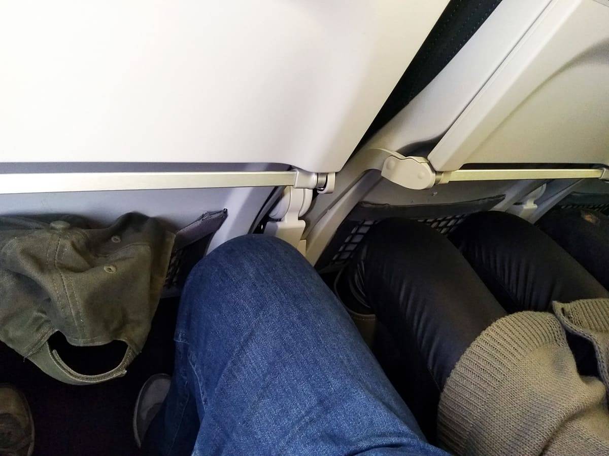 Расстояние для ног в Боинге моноклассной компоновки во второй части салона (рост 180 см).
