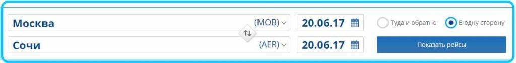 Первое, что стоит сделать пассажиру — посмотреть расписание. Для этого необходимо задать необходимое направление (указать город отлета и конечный пункт), указать дату путешествия, а также планы на будущий перелет — в одну сторону или туда и обратно. После этого жмите на кнопку показать рейсы.