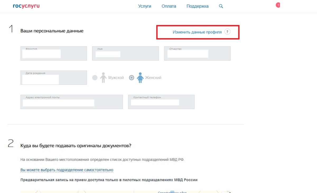 Данные переносятся автоматически из личного кабинета учетной записи гражданина. В случае обнаружения ошибок, необходимо их подправить. Для этого нажать на строку над персональными сведениями «Изменить данные профиля».