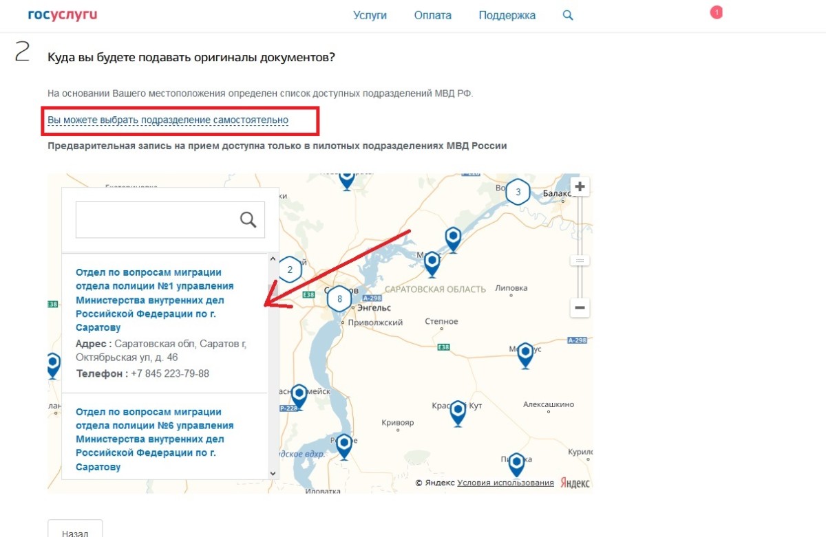 Список формируется на основании местоположения гражданина. Если необходимого варианта нет, то выберите подразделение самостоятельно, нажав на соответствующую строку.