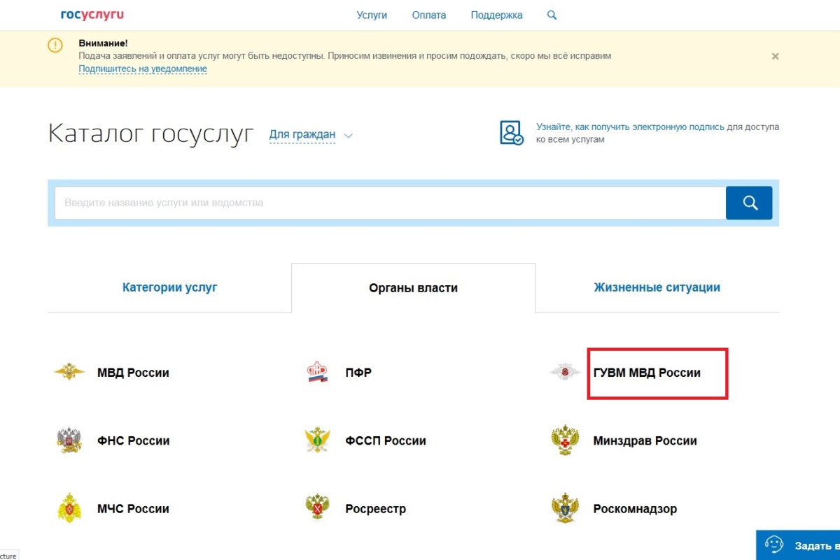 - Открыть раздел “Услуги” и либо подпункт “Паспорта, регистрации, визы” пункта “Категории”, либо “ГУВМ МВД России” пункта “Органы власти”;
