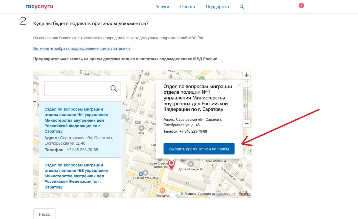 После нажатия кнопки “Записаться на прием” пользователю откроется страница, где в 1 пункте будут указаны его контактные данные (заполняются автоматически на сайте), а в пункте 2 можно будет выбрать подразделение, в которое можно записаться на прием