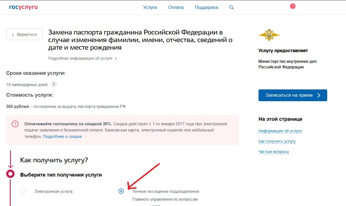 Шаг 7. В графе «Как получить услугу» выберите тип получения «личное посещение подразделения ГУВМ МВД».