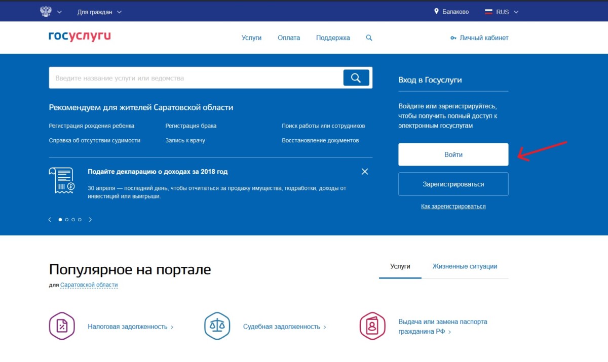 Шаг 1. Для начала зайдите на сайт https://www.gosuslugi.ru/. Для этого нажать на кнопку «Войти» в правом верхнем углу. (1) Если пользователь не имеет аккаунта, то потребуется регистрация и дальнейшее подтверждение личности.