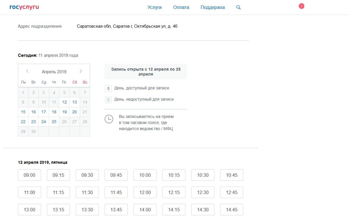 Синим цветом выделены свободные даты, серым – недоступные. Запись производится в том часовом поясе, в котором находится государственное учреждение.