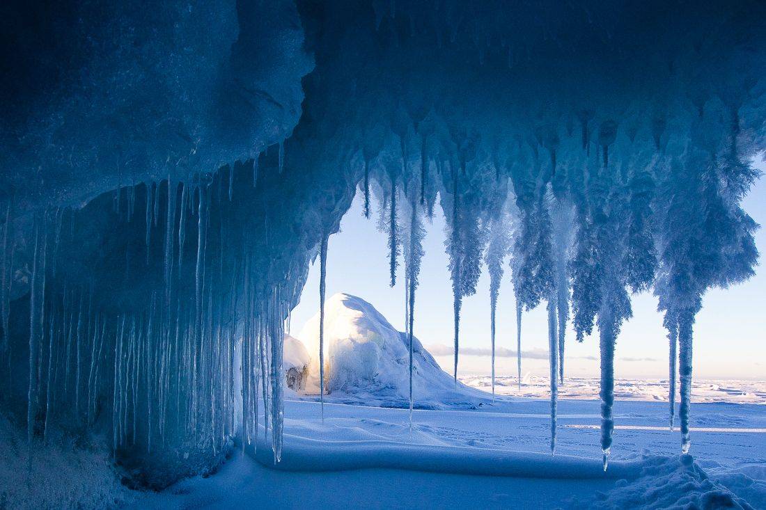 Вокруг залива Малое море прячется множество ледяных пещер – загляните в них и поразитесь причудливым изгибам льда. Такие гроты называют сокуи, и образуются они при волнении, когда лед еще не встал, но берега уже холодные.