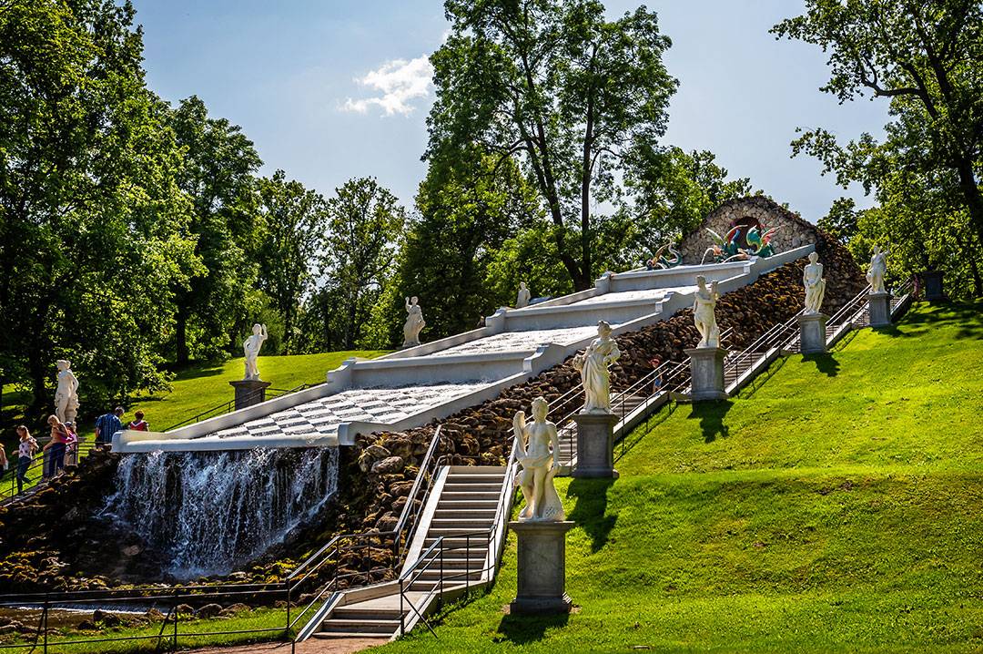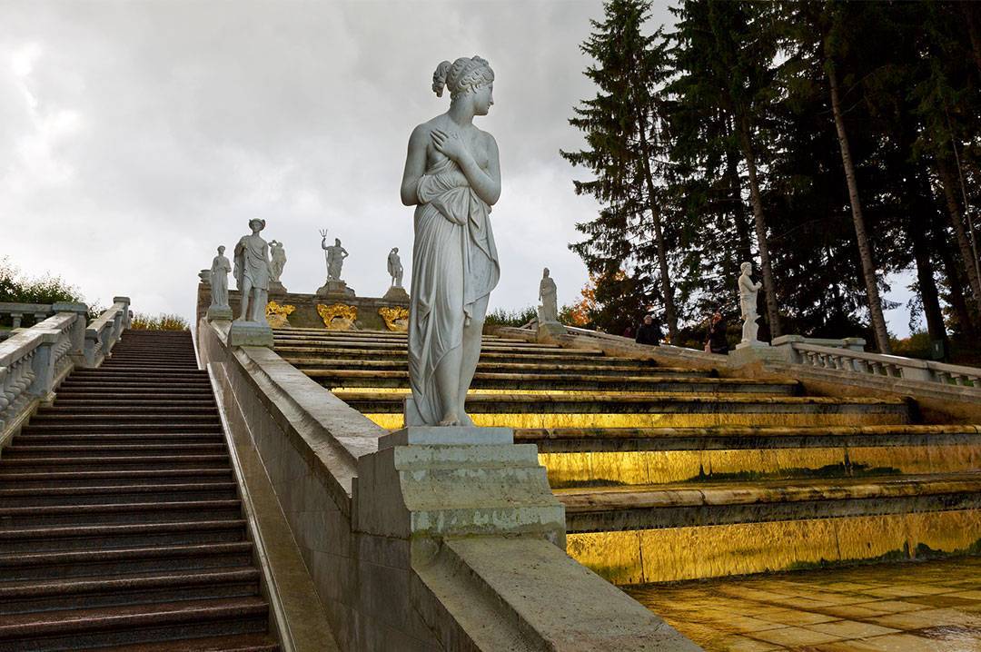 - Как выглядит: каскад из мраморных ступеней, отделанных позолоченными листами, украшенный мраморными и золочеными статуями античных богов и героев.