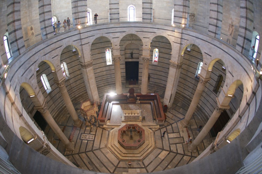 В середине уникального памятника архитектуры находится огромное количество крытых галерей, соединенных между собой украшенными различными орнаментами арками. В самом низу Пизанской башни расположен Зал Рыбы, получивший свое название из-за выбитого на стене барельефа рыбы, одного из символов христианства.