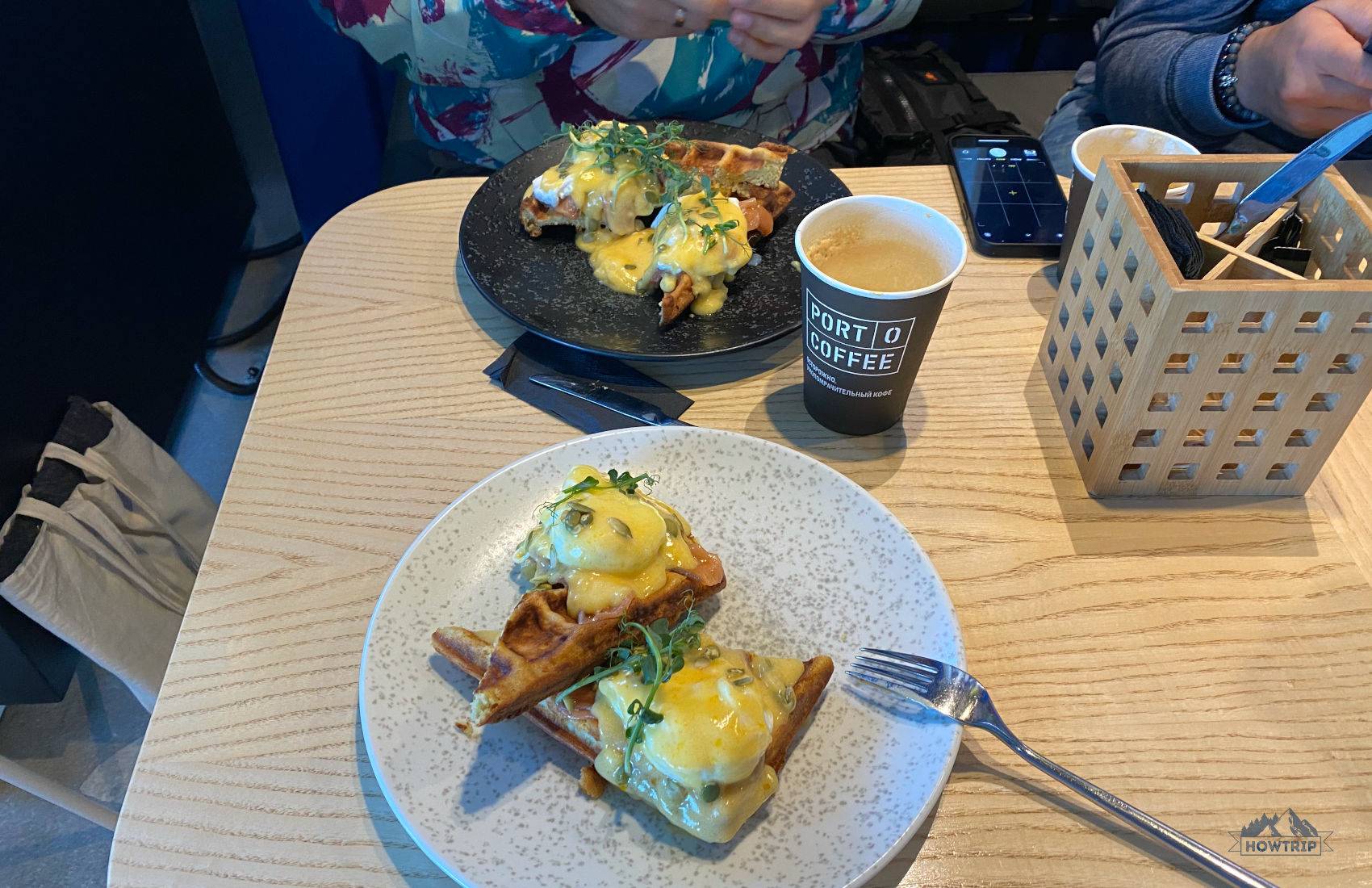 - Port-o-Coffee (по всей области) — в первую очередь вкусный кофе, хорошая кухня. Десерт в виде огромной бельгийской вафли с мороженым и шакшука — 580 рублей. В Зеленоградске особо инстаграмная и приятная локация!