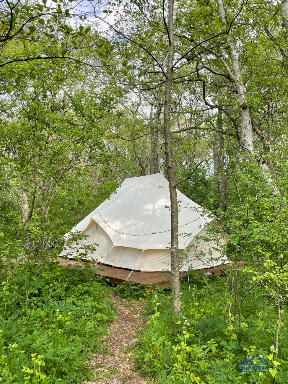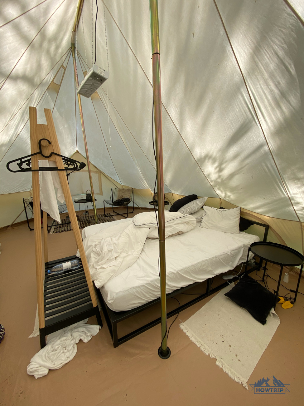 В таких оборудованных палатках посреди леса в Поляна Глэмпинг мы жили, ниже будут фотографии изнутри. Даже подогреваемые одеяла есть