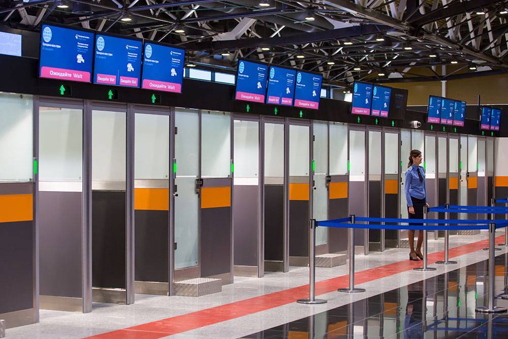 В аэропорту пограничный контроль проходят в специальных кабинах — в них пускают по одному человеку. На расстоянии 1,5 метра до кабин есть цветная линия — через нее нельзя переступать, пока пограничник не отпустит впереди стоящего человека. Такие строгие правила ввели, чтобы люди не могли бесконтрольно проходить через кабину, де-юре — через государственную границу. Исключения делают только для тех пассажиров, которые сопровождают людей с инвалидностью или летят с несовершеннолетними детьми.