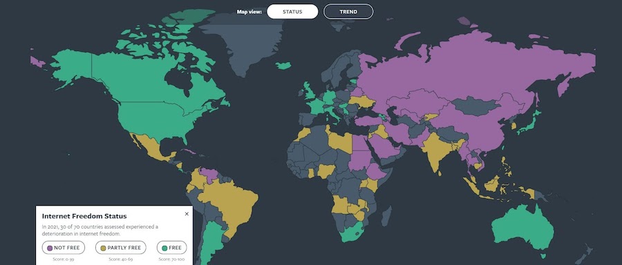 Параллельно с вопросом конфиденциальности аналитики Freedom House отмечают тенденцию снижения свободы выражения мнения в интернете из-за государственного надзора, ограниченного доступа и отсутствия эффективного сопротивления.