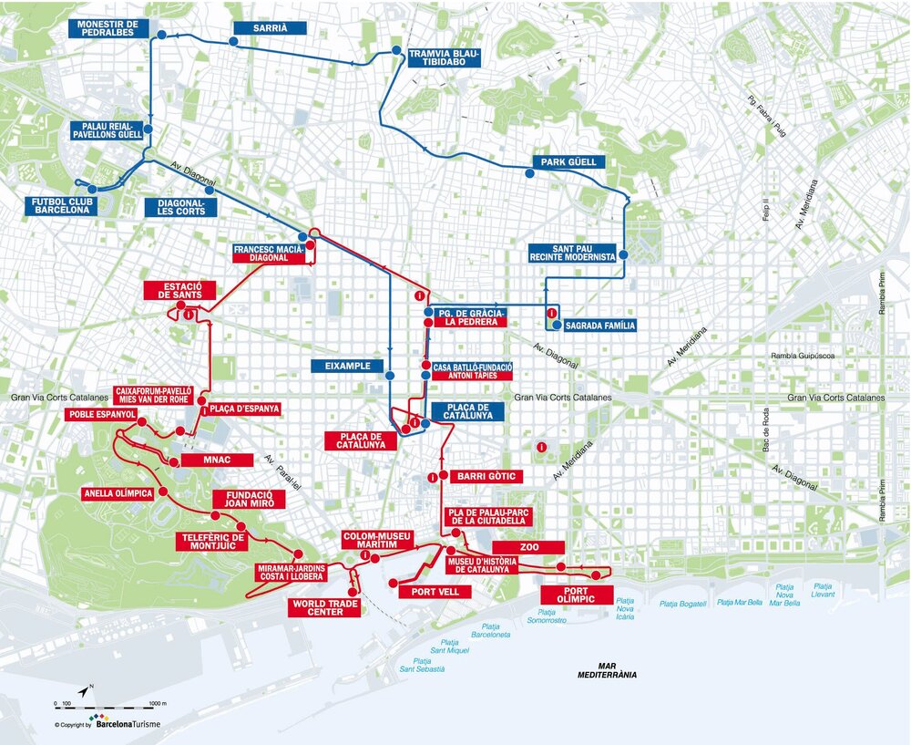- Синий — от площади Plaça Catalunya с остановками у знаменитой архитектуры Гауди — до Park Güell и Tibidabo (длительность маршрута 2 часа).