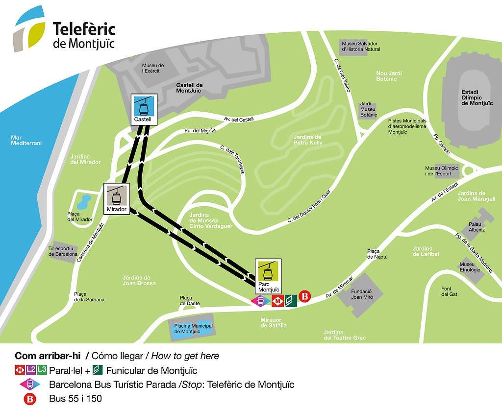 До отправной точки канатной дороги Telefèric de Montjuïc можно добраться, доехав до станции метро Paral·lel по зеленой L3 или фиолетовой линии L2. Далее под землей по тому же билету сесть на фуникулер.