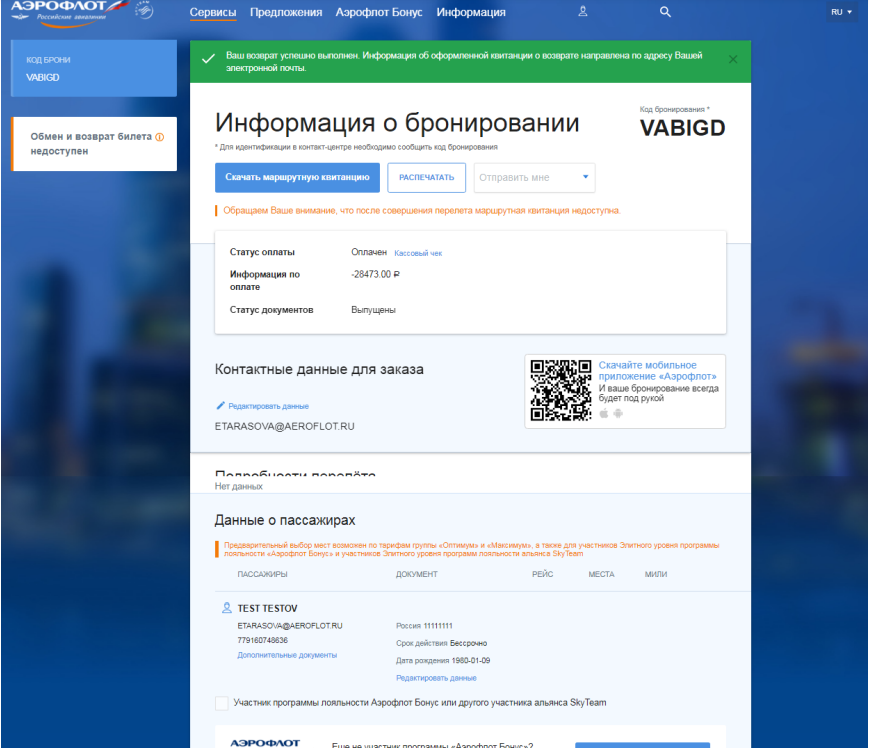 Шаг 4. После нажатия кнопки «Вернуть билеты» авиабилет будет аннулирован. После этого откроется страница «Информация о бронировании», где можно будет посмотреть, распечатать или отправить по электронной почте маршрутную квитанцию электронного билета и квитанцию о возврате неиспользованной перевозки.
