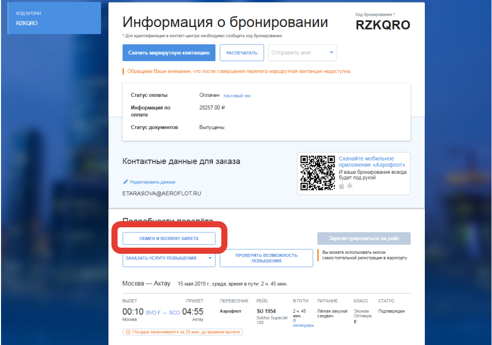 На электронный адрес, указанный при бронировании, высылается сообщение с маршрутной квитанцией электронного авиабилета и квитанцией о возврате неиспользованной перевозки во вложенном файле.