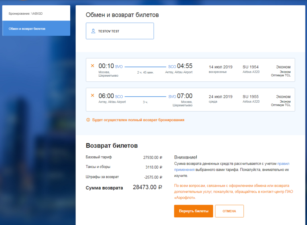 Функционал онлайн-возврата позволяет в автоматизированном режиме производить оформление возврата авиабилетов. В процессе оформления возврата сумма, подлежащая возврату, будет рассчитана в соответствии с тарифными правилами.