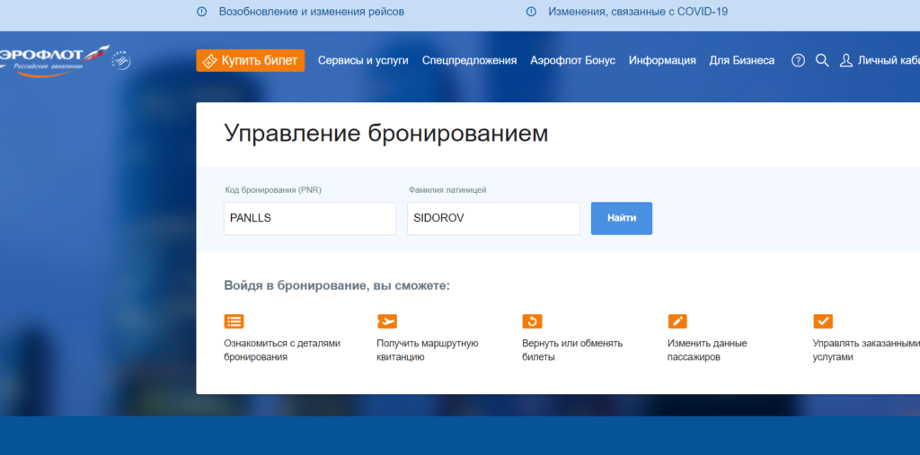 После завершения всех формальностей можно воспользоваться функцией «Управление бронированием». Здесь разрешается вносить изменения в уже созданную бронь:
