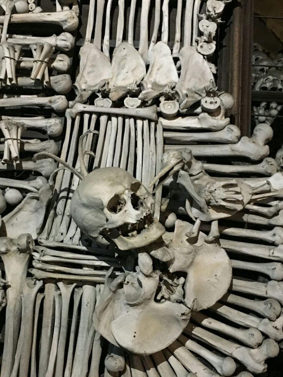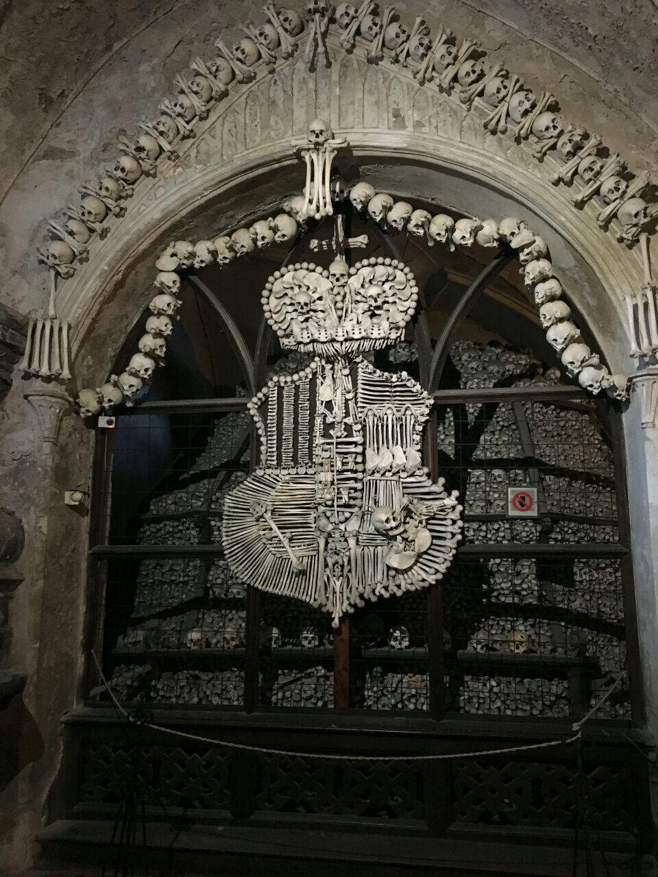 Это такая очень странная церковь, внутри которой почти все сделано из человеческих костей (люстра, светильники, герб и т.д.).