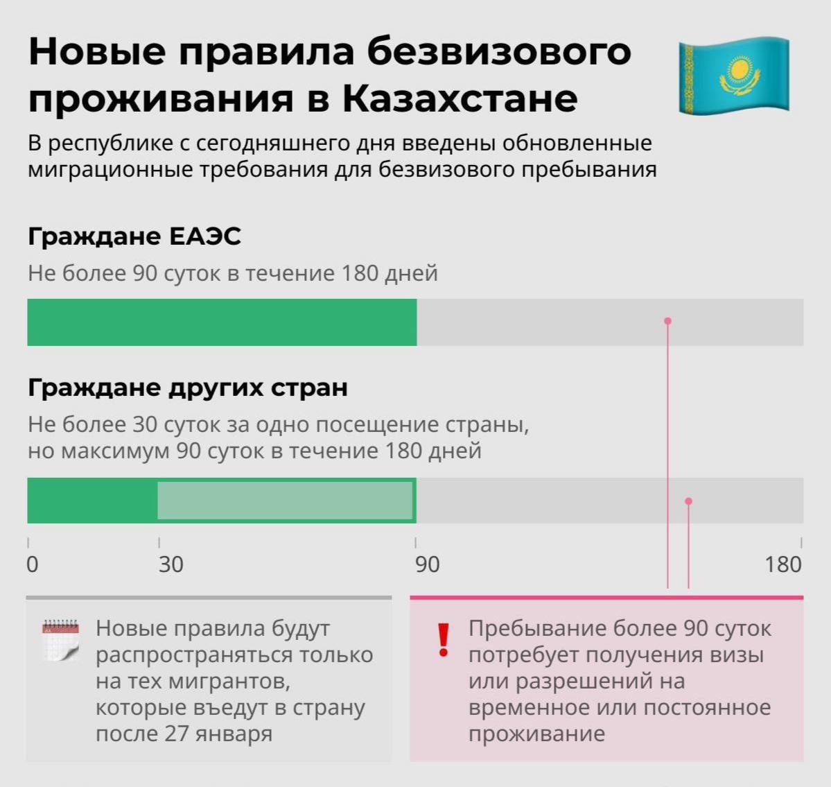 По новым правилам россияне и другие иностранцы, въезжающие в Казахстан без виз, не смогут бесконечно продлевать срок проживания в стране. С 2020 года срок пребывания граждан России в Казахстане ограничен 90 днями в полугодие. Лимит может быть использован за одну поездку или несколько. Аналогичная норма действует для граждан Казахстана в РФ.