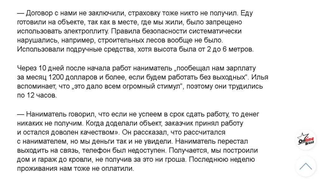 Необходимо помнить о том, что среди работодателей встречаются и порядочные люди, и такие, для которых важно поскорее получить прибыль, поэтому они не считают нужным создавать безопасные и комфортные условия труда для своих работников. А стоит ли обещанная зарплата в 800-1000 долларов США 12-часового изнурительного труда и проживания в небольшой комнатке на 6-10 человек, – решать мигранту
