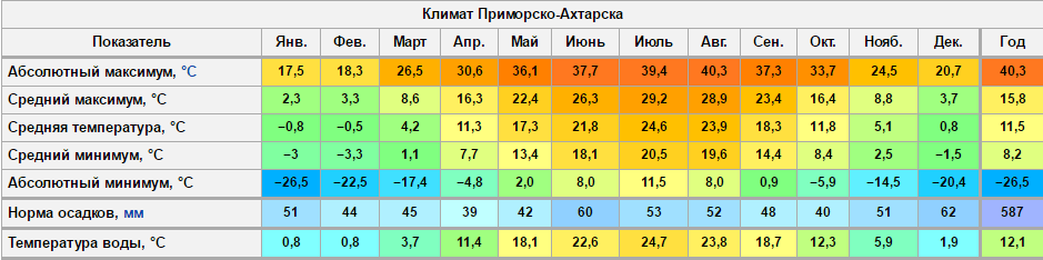 - Зима мягкая, влажная, устойчивого снежного покрова не образуется. Средняя температура января −0,8 °C, один раз даже видел как азовское море леденеет и по нему катаются на коньках, забавное зрелище, видеть, что у местного населения они есть.