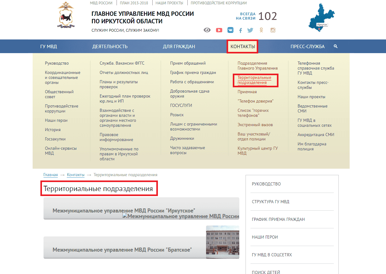 Чтобы не терять время, можно периодически звонить работникам регионального подразделения МВД. В этом случае проверка разрешения на проживание может осуществляться по номеру или фамилии, которые записаны в бланке. Контактные данные ведомства можно найти на его региональном сайте, выбрав в разделе «Контакты» пункт «Территориальные подразделения»: