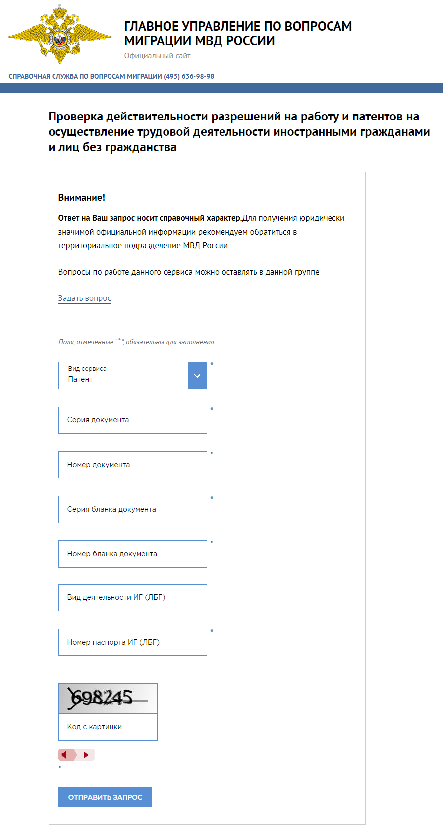 Хотя в интернете предлагают разные варианты, мы рекомендуем проверить патент на работу онлайн с помощью специального сервиса МВД РФ, которое после упразднения ФМС в 2016 году курирует вопросы миграционного учета в стране.