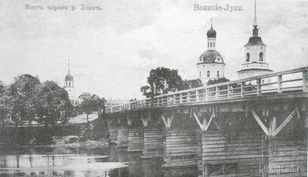 Большой мост через реку Ловать в Великих Луках (последний раз разрушен в 1956 году). Справа видна Троицкая церковь (разрушена в 1935 году), слева — Свято-Вознесенская церковь.