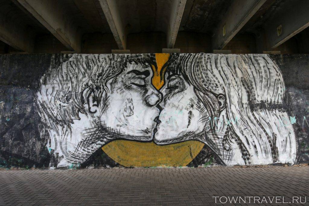 Под мостом – настенная живопись. Рисунок с поцелуем – работа великолукского художника, который уже давно занимается стрит-артом.