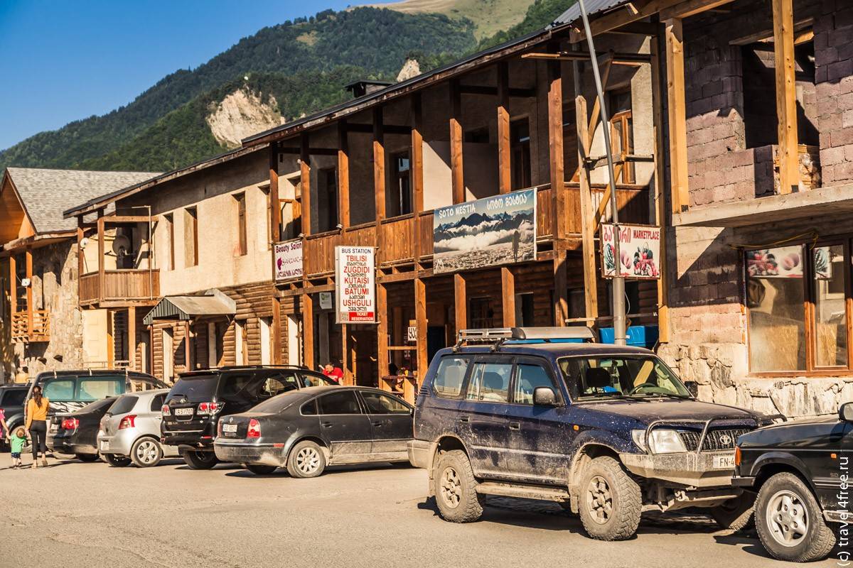 Село Ушгули – это те самые открыточные виды Сванетии. Добираться до Ушгули на своей машине не рекомендуется. Но и брать экскурсию тоже накладно, так как рассказывать там не о чем. В Местии, также как и в Степанцминде можно купить место в машине, которая отвезет вас туда-обратно. В гесте, в котором вы остановитесь, вам помогут организовать такую поездку. Или просто на площади в Местии ищите вот такие вывески – это офисы турфирм, которые возят по разным городам. Если мало пассажиров наберется, поедете на джипе, если много на Митцубиси Делика.