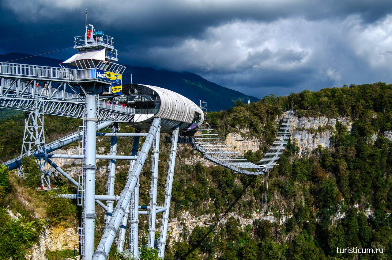 Скайпарк в Сочи – это первый и единственный в России парк экстремальных приключений на высоте. Его идейным вдохновителем стал экстремал Алан Хаккетт из Новой Зеландии, открывший несколько точек банджи-джампинга в разных странах мира. Скажем пару слов о банджи-джампинге, если вы до сих пор с ним не знакомы: смельчаков, отважившихся на это умопомрачительное развлечение, привязывают к длинному эластичному тросу и сбрасывают с огромной высоты в свободное падение. В сочинском скайпарке такие прыжки совершаются с моста Скайбридж – одного из самых высоких в мире. Две платформы для прыжков расположены на высоте 69 и 207 метров: после такого сумасшедшего полета многие экстремалы утверждают, что они словно родились заново! Кроме диких прыжков в пропасть скайпарк предлагает своим бесстрашным посетителям прокатиться на аттракционе Мега-Тролль, самом быстром троллее в мире. Открытый вагончик, скользящий по металлическому тросу, несется с головокружительной скоростью 120 км/ч над бездной Ахштырского ущелья. Далеко не каждому по силам преодолеть свой страх и испытать бешеный всплеск адреналина на аттракционах скайпарка. Но если вы все же решились на это – ваша смелость достойна восхищения!