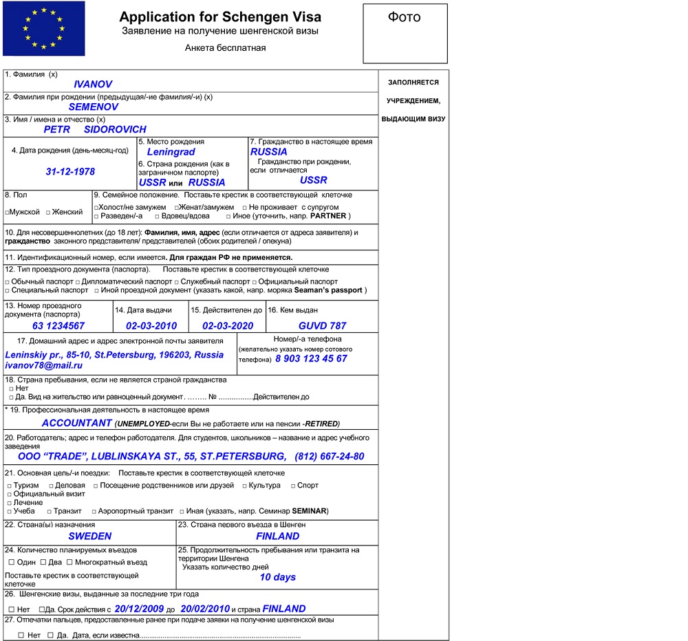 Анкета для визы в Швецию. Анкета, заполненная на английском либо на шведском языке, должна быть лично подписана заявителем; на ребенка также потребуется анкета, подпись в которой ставит родитель.