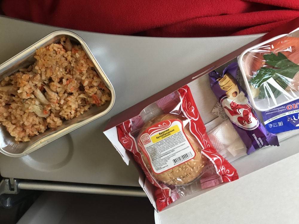 Из основных блюд рацион периодически меняется, но в целом меню можно описать как небольшую порцию пайка, состоящую из: тефтелей с гречкой, риса с куриной грудкой. В целом для, например, трехчасового полета, данного рациона оказывается более чем достаточно. На коротких рейсах подают набор, включающий бутерброд, печень и сладость.