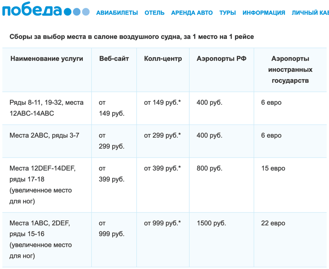 Full-cost авиакомпании редко позволяют себе взимать дополнительную плату за выбор места, но лоукостеры делают это всегда. Ryanair берет за такую «услугу» от 3€, а наш аналог, Победа, — от 149 руб. или от 6€ — на международных рейсах. Причем заметьте, места ранжируются по удобству, и «цена» у них разная.