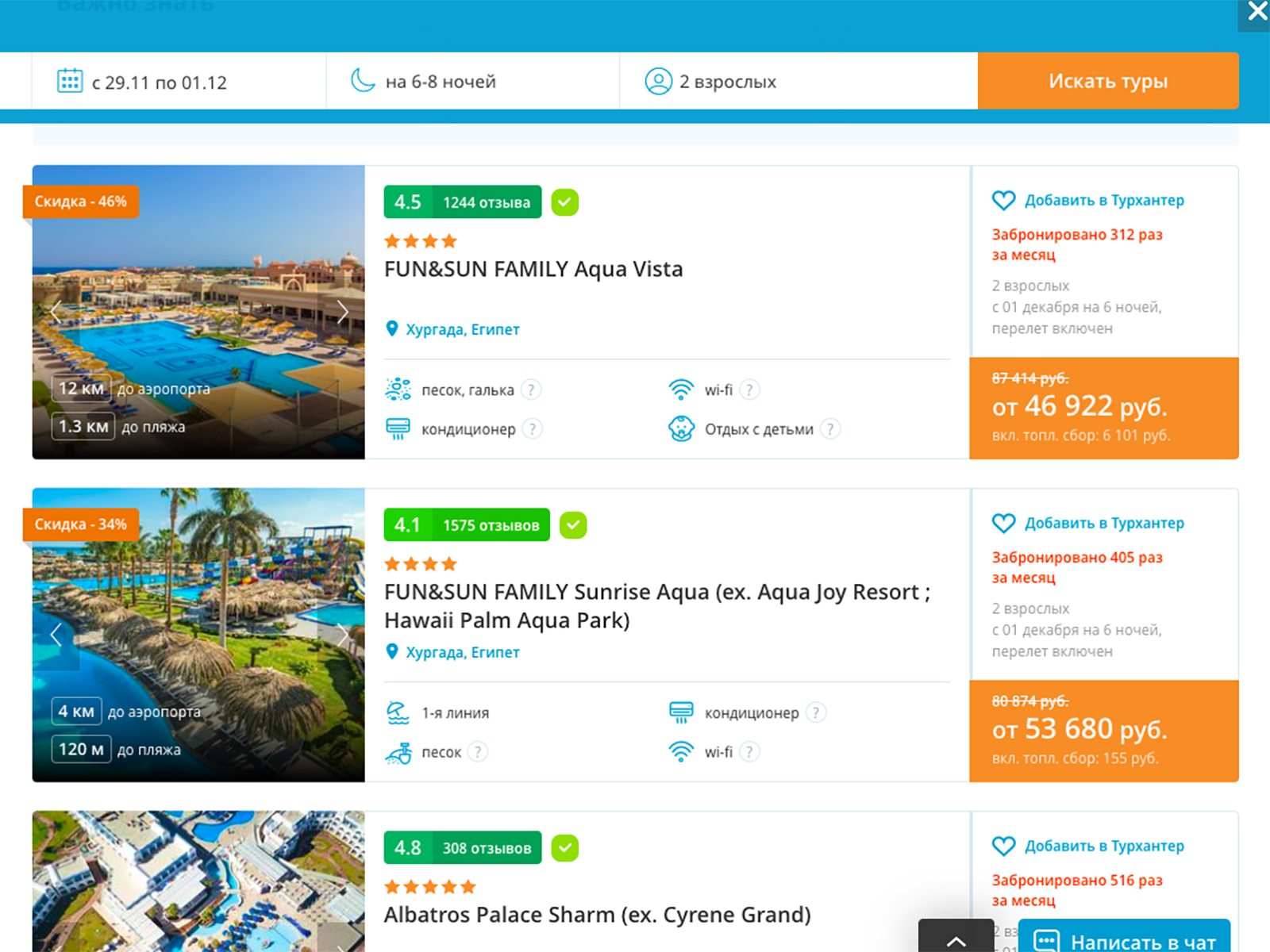 В России придумали специальные сервисы-агрегаторы, чтобы смотреть существующие туры и сравнивать цены от всех туроператоров на одном сайте. Поисковики очень удобные — можно выставлять свои пожелания к туру: даты, страну, звездность отеля, тип питания, наличие бассейна, удаленность от моря и многое другое.