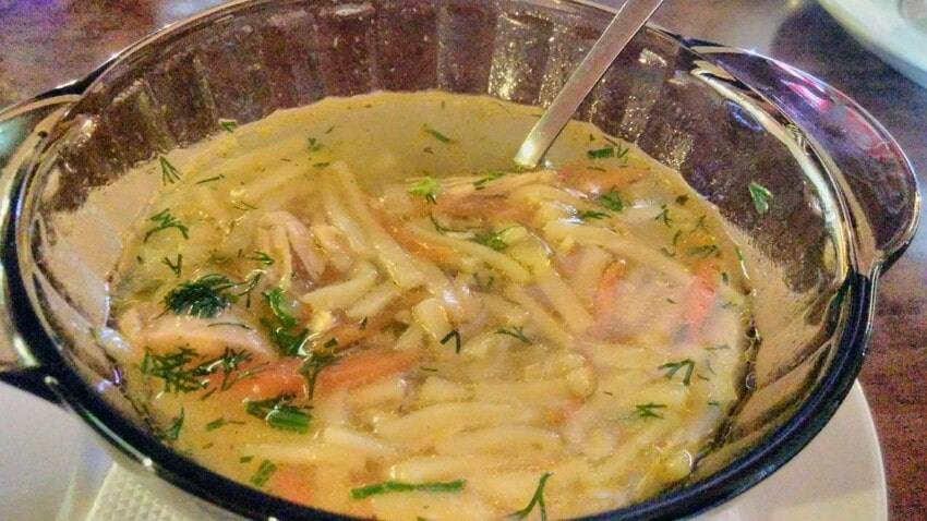 Блюда вполне съедобные, мы пробовали салат Цезарь и куриный суп-лапшу, бефстроганов с картофельным пюре и судак по старославянски.