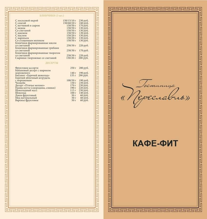 Небольшое, но довольно уютное кафе “Fit” находится при одной из самых больших гостиниц города – “Переславль”. Однако несмотря на это место это не распиаренное, да и с дороги его просто так не заметишь, если только не знать специально куда ехать.