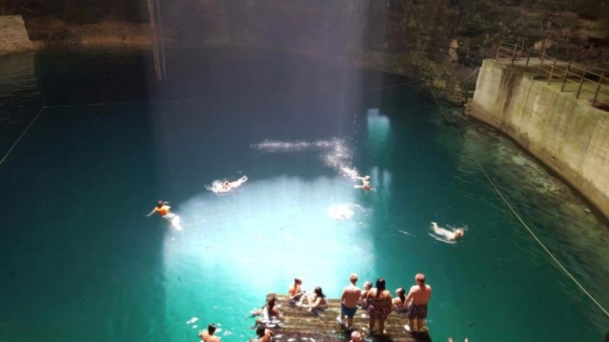 После поездки на лодках не мешало бы и подкрепиться. Обед запланирован в удивительном месте – парке отдыха и сеноте Хубику. Сеноты – карстовые пещеры, являются визитной карточкой полуострова Юкатан и привлекают множество как мексиканских, так и иностранных туристов. Сенотов на Юкатане очень много, говорят, что для того, чтобы посетить по одному сеноту в день, не хватит и года. Мы уже рассказывали вам о сеноте Ик-Киль, который мы видели, когда ездили в путешествие по археологических зонам майя на Юкатане Тулум-Коба-Чичен-Ица. Сегодня мы посещаем еще одно из этих удивительных подземных озер, которое радует нас прохладой и тенью. Небольшой заплыв в озере Хубику с кристально чистой водой – то, что нужно, для того чтобы набраться сил для второй части маршрута.