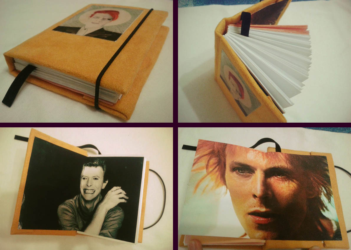 Фотографии Дэвида Боуи на форзацах и маленькое изображение на обложке. Яркая желтая искусственная замша (очень мягкая и приятная), белые листы + один блок цветных, черная резинка и черное замшевое ляссе.