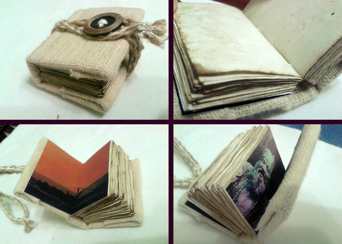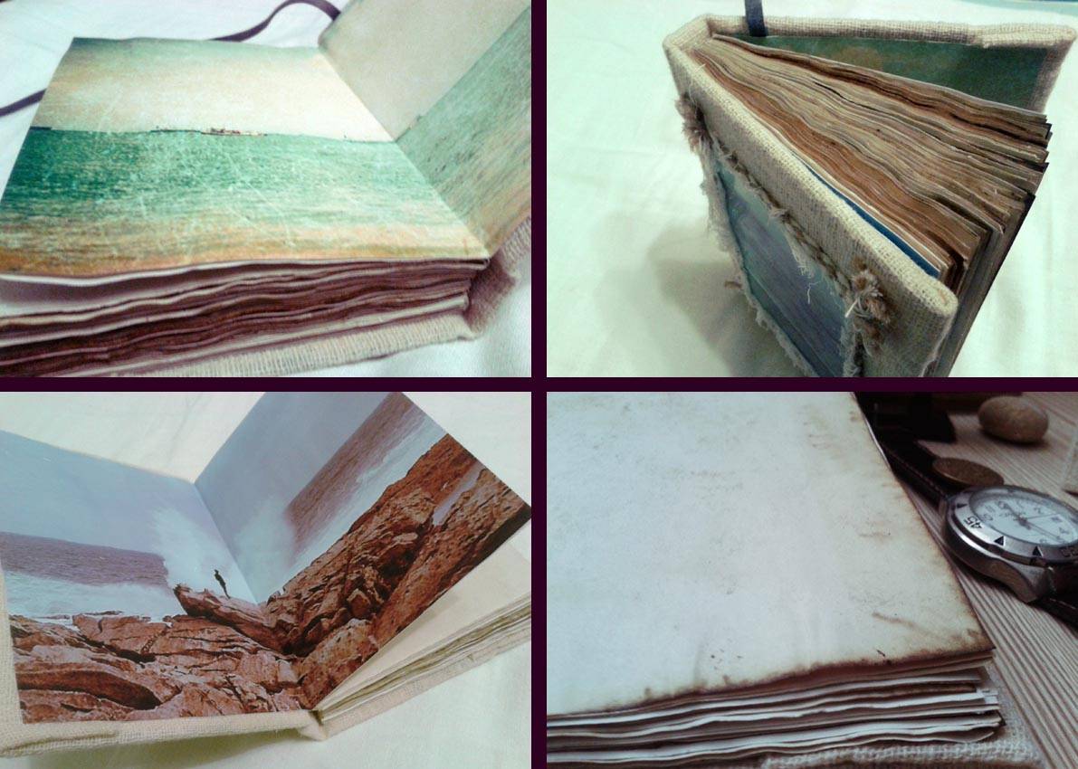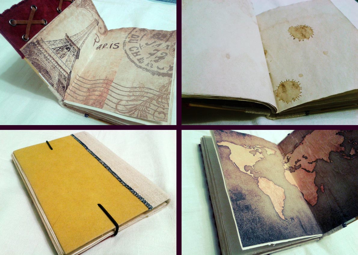 Желтая бархатная бумага на обложке. Корешок обернут в ткань и прошит нитью. Лицевая сторона обложки с левой стороны обернута в полоску бардового цвета из искусственной замши. Черная резинка-застежка. Состаренные листы с ароматом кофе. Иллюстрации на форзацах: винтажная картинка с Эйфелевой башней спереди и карта мира сзади.